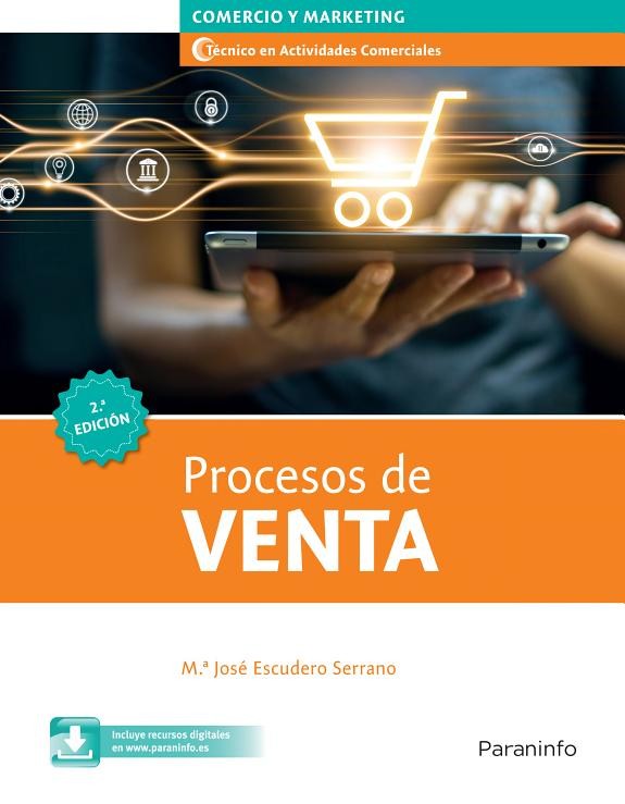 Los consumidores y las empresas cada vez recurren más a las tiendas online, por lo que en esta nueva edición se han incorporado las técnicas más actuales para que el alumnado domine tanto la venta personal como la venta online. Este libro desarrolla los contenidos del módulo profesional de Procesos de Venta, del Ciclo Formativo de grado medio en Actividades Comerciales, perteneciente a la familia profesional de Comercio y Marketing. Asimismo, el módulo profesional de Procesos de Venta (Cód. 1232) está asociado a la Unidad de Competencia Realizar la venta de productos y/o servicios a través de los diferentes canales de comercialización (Cód. UC0239_2). Esta nueva edición de Procesos de venta se acerca a las últimas tendencias de consumo y compra, pues cada vez están más equilibradas la venta personal y la venta virtual por internet. Se exponen técnicas de venta personal en tienda física o despacho del comprador, junto con la compra online en la cual el usuario de la web necesita ayuda de un vendedor profesional. Con un lenguaje claro y sencillo, los contenidos teóricos se exponen de manera exhaustiva y rigurosa, acompañados de ejemplos reales y de casos prácticos resueltos, así como de actividades propuestas para que el alumnado aplique los conocimientos adquiridos. Se incluyen también numerosos recuadros complementarios con vocabulario, información adicional o importante y recordatorios. Al final de cada unidad se presenta un resumen de conceptos para favorecer el repaso y la fijación de conocimientos, además de actividades finales de comprobación y de aplicación, tanto para trabajo individual como en equipo, según la ocasión. Por todo ello, esta obra es una herramienta idónea para los alumnos que quieren obtener el título de Técnico en Actividades Comerciales, así como para sus formadores y los profesionales en activo que deseen actualizarse. La autora, María José Escudero Serrano, perito mercantil y licenciada en Ciencias Empresariales por la Universidad de Valencia, cuenta con más de 35 años de experiencia docente. Es autora de otros títulos de formación publicados por esta editorial.