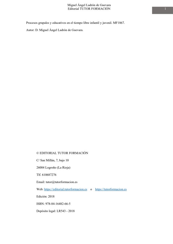 Este Manual es el más adecuado para impartir el MF1867 «Procesos grupales y educativos en el tiempo libre infantil y juvenil» de los Certificados de Profesionalidad, y cumple fielmente con los contenidos del Real Decreto. Puede solicitar gratuitamente las soluciones a todas las actividades y al examen final en el email tutor@tutorformacion.es Capacidades que se adquieren con este Manual: – Identificar los aspectos que caracterizan el desarrollo infantil y juvenil aplicables al tiempo libre para adecuar las actividades a las personas participantes en ellas. – Elegir contenidos y estrategias de intervención en función de la diversidad de las personas y los grupos. – Aplicar técnicas grupales en actividades de tiempo libre para la infancia y la juventud. Índice: Aplicación del desarrollo psicosocial infantil y juvenil en las propuestas de actividades de tiempo libre 4 1. Valoración de las fases de desarrollo personal: etapas en el desarrollo infantil y juvenil, desarrollo integral en infancia, adolescencia y juventud. 5 1.1. Etapas en el desarrollo infantil y juvenil. 5 1.2. Desarrollo integral en infancia, adolescencia y juventud. 9 2. Sistemática de valoración de las preferencias y propuestas de actividades de tiempo libre según los grupos de edad y/o estadios evolutivos y nivel madurativo. 25 3. Técnicas de valoración de las implicaciones educativas según los niveles de desarrollo y maduración. 28 4. Procedimientos de valoración e intervención educativa ante diferencias entre los estadios madurativos y la realidad de los participantes en las actividades. 30 5. Sistemática para el análisis y gestión de fuentes de información sobre desarrollo psicosocial y sociología juvenil. Análisis de las manifestaciones culturales infantil y juvenil….32 6. Test de investigación. 35 Técnicas de intervención educativa en función de la diversidad individual y grupal 38 1. Estrategias para la integración social en las actividades de tiempo libre infantil y juvenil. Análisis de causas que dificultan la integración social: culturales, socioeconómicas, etc. 39 2. Técnicas y recursos básicos de prevención y detección de conductas asociales, racistas y/o xenófobas. Técnicas de observación e intervención. 43 2.1. Prevención y sensibilización en el ámbito escolar y de ocio y tiempo libre. 44 2.2. Cómo actuar ante la discriminación y los incidentes motivados por el odio. 48 3. Técnicas de trabajo con personas con discapacidad: tipos de discapacidad, características y orientaciones. 57 3.1. Discapacidad y ocio y tiempo libre. 57 3.2. Tipos de discapacidad y orientaciones. 58 4. Estrategias y técnicas de intervención para la educación intercultural. 68 4.1. Procedimientos metodológicos para trabajar la Educación Intercultural. 70 4.2. Conclusiones. 77 5. Metodología de coeducación: construcción social de los roles, diversidad, intimidad, etc. 80 5.1. ¿Cómo planificar una práctica coeducativa en el tiempo libre? 81 5.2. Los pasos para la planificación de la actividad. 82 5.3. Elementos que hay que tener en cuenta para realizar una práctica coeducativa en las actividades de tiempo libre. 85 6. Identificación de los servicios especializados básicos que trabajan las distintas problemáticas individuales y sociales: las redes básicas de servicios sociales. 92 6.1. Los servicios sociales básicos. 92 6.2. Los servicios sociales especializados. 93 6.3. La Atención, la prevención y la promoción social. 94 6.4. Catálogos de Servicios Sociales. 95 7. Test de investigación. 96 Técnicas grupales en el desarrollo de actividades de tiempo libre infantil y juvenil 98 1. Metodología para la valoración y gestión de grupos. 99 1.1. Tipos de grupos. 99 1.2. Elementos estructurales del grupo. 100 1.3. Los roles en el grupo. 104 1.4. Fases de desarrollo grupal. 109 1.5. Dinámicas grupales. 112 2. Valoración de rasgos característicos y diferenciales en los grupos de tiempo libre. 117 3. Análisis y aplicación de técnicas grupales. 118 3.1. Dinámicas en la etapa de inicio grupal. 118 3.2. Dinámicas en la etapa de desarrollo grupal. 122 3.3. Dinámicas en la etapa de madurez grupal. 123 3.4. Dinámicas de roles y liderazgo para el trabajo grupal. 124 3.5. Dinámicas de comunicación. 133 4. Valoración de las funciones del/a monitor/a en el grupo. 139 5. Test de investigación. 142