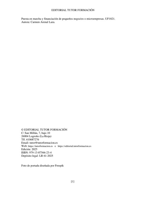 Este Manual es el más adecuado para impartir la UF1821 «Puesta en marcha y financiación de pequeños negocios o microempresas» de los Certificados de Profesionalidad, y cumple fielmente con los contenidos del Real Decreto. Puede solicitar gratuitamente las soluciones a todas las actividades y al examen final en el email tutor@tutorformacion.es Capacidades que se adquieren con este Manual: – Analizar las acciones necesarias para la constitución y desarrollo de la actividad de pequeños negocios distinguiendo los organismos relacionados, sus trámites y documentación asociada. – Seleccionar las alternativas de financiación más ventajosas de entre las disponibles en el mercado calculando los costes de las mismas a través de aplicaciones ofimáticas e identificando los trámites a seguir de cada una de ellas. Índice: Inicio de la actividad económica en pequeños negocios o microempresas 5 1. Introducción. 6 2. Trámites de constitución según la forma jurídica. 7 2.1. El Profesional Autónomo. 7 2.2. La Sociedad Unipersonal. 7 2.3. La Sociedad Civil. 8 2.4. La Comunidad de Bienes. 8 2.5. La Sociedad Limitada. 9 2.6. La Sociedad Anónima. 10 2.7. La Sociedad Limitada Laboral. 11 2.8. La Sociedad Anónima Laboral. 11 2.9. La Cooperativa. 11 3. La Seguridad Social. 15 3.1. Trámites según régimen aplicable. 15 4. Organismos públicos relacionados con la constitución, puesta en marcha y modificación de las circunstancias jurídicas de pequeños negocios o microempresas. 77 4.1. Funciones de los organismos. 77 4.2. Documentación a presentar. 77 4.3. Los plazos y formas de presentación de documentos. 89 4.4. La Ventanilla Única Empresarial. 98 4.5. Las oficinas virtuales. 99 5. Los registros de propiedad y sus funciones. 102 5.1. Tipos de registro. 102 5.2. Documentación. 103 5.3. Tramitación. 103 5.4. Normativa aplicable. 104 6. Los seguros de responsabilidad civil en pequeños negocios o microempresas. 105 6.1. Características y tipología de los contratos del seguro de responsabilidad civil. 105 6.2. La valoración y cobertura del riesgo. 107 6.3. Efectos de la póliza de responsabilidad civil frente a terceros. 108 7. Resumen. 109 8. Autoevaluación. 110 Financiación de pequeños negocios o microempresas 112 1. Introducción. 113 2. Productos de financiación ajena para pequeños negocios. 114 2.1. Ventajas e inconvenientes 114 2.2. Los préstamos. 115 2.3. El crédito comercial. 117 2.4. El crédito bancario. 119 2.5. Operaciones de leasing. 122 2.6. El Renting. 126 2.7. El factoring (cesión de facturas). 128 2.8. El forfaiting (cesión de pagares y letras de cambio). 130 2.9. Los descuentos comerciales bancarios. 133 2.10. Los créditos oficiales. 134 2.11. Otros. 137 3. Otras formas de financiación de ámbito local, autonómico y nacional para pequeños negocios o microempresas. 141 3.1. Los subsidios para empresas. 141 3.2. Los programas de Ayuda. 141 3.3. Subvenciones. 144 3.4. Organismos, documentación, tramitación y plazos. 146 4. Resumen. 151 5. Autoevaluación. 152 Bibliografía 154