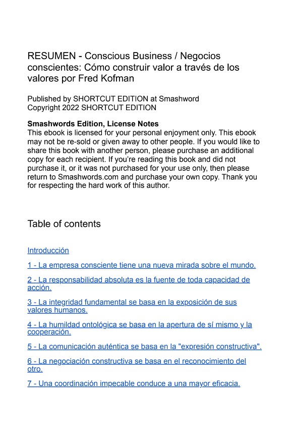 Al leer este resumen, se dará cuenta de que, en una empresa, el «éxito más allá del éxito» no consiste únicamente en obtener beneficios económicos, sino también en crear valor humano y social. También aprenderá : que una empresa consciente tiene en cuenta las dimensiones física, mental y espiritual de sus empleados; cómo producir los mejores resultados posibles respetando sus valores; cómo el autodominio ayuda a desarrollar una comunidad humana consciente; que para alcanzar la excelencia, también hay que progresar a nivel humano. En este libro, Fred Kofman -doctor en economía y consultor en desarrollo de liderazgo- proporciona las claves para leer el mundo empresarial y las palancas para la acción concreta. Nos muestra cómo es esencial para una empresa crear valor humano y social a corto, medio y largo plazo. Tanto si es un empleado como un directivo, la mejor manera de desempeñar eficazmente su papel de agente económico es mediante la conciencia de sí mismo y de su entorno. La conciencia de nuestro papel en la empresa es la condición sine qua non de un buen liderazgo personal: debemos saber gestionarnos a nosotros mismos antes de saber gestionar a los demás.