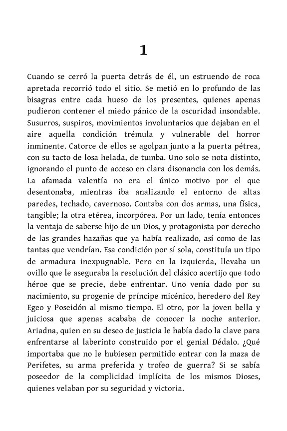 Confiado, seguro, Teseo entra al laberinto. Se sabe protagonista de su propio mito y cuenta con la ayuda de Ariadna y Dédalo. Es el deber del héroe cumplir su gesta para ganar el título, vencer al mal y contar el cuento. Pero en la oscuridad de las infinitas vueltas buscando a su enemigo, el héroe griego encontrará mucho más. Este relato acompaña los pasos de Teseo en las tinieblas, surcando siglos de mitología y voces cruzadas. Es un ejercicio de tejido, jugando con las tramas, los protagonistas, las incontables posibilidades que se abren en un lugar eterno. Mezclando suspenso con terror, historia con ficción, en una aventura con tantos secretos como un sitio de infinitas soluciones puede albergar.