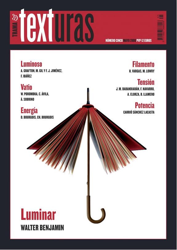 Índice 01_Átomo Editorial 02_Luminar Traslado mi biblioteca Walter Benjamin 03_Luminoso La lectura futura Anthony Grafton Del editor friki al editor wiki Manuel Gil & Francisco Javier Jiménez La gestión del texto: edición tradicional y nuevos soportes Federico Ibáñez Soler 04_Potencia Carrió Sánchez Lacasta 05_Vatio Intermediación Wiebke Porombka Trazas del libro ideal César Ávila Somos lo que leemos Álvaro Sobrino 06_Energía Vida de un editor . Dominique Bourgois Mi catálogo es mi vida Christian Bourgois 07_Filamento Morir tocando el ukelele o de cómo Lowry conoció el mezcal Hugo Vargas 08_Tensión Hábitos de lectura. Otra mirada José María Barandiarán Cafebabel.com en la era del periodismo europeo Fernando Navarro Sordo San León Librero Antonio Elorza (Al menos) una razón para leer Braulio Llamero 09_Luz Libros y blogs