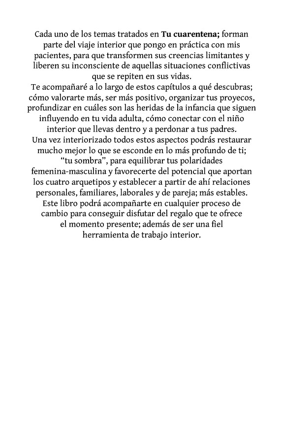 Cada uno de los temas tratados en Tu cuarentena; forman parte del viaje interior que pongo en práctica con mis pacientes, para que transformen sus creencias limitantes y liberen su inconsciente de aquellas situaciones conflictivas que se repiten en sus vidas. Te acompañaré a lo largo de estos capítulos a que descubras; cómo valorarte más, ser más positivo, organizar tus proyectos, profundizar en cuáles son las heridas de la infancia que siguen influyendo en tu vida adulta, cómo conectar con el niño interior que llevas dentro y a perdonar a tus padres. Una vez interiorizados todos estos aspectos; podrás restaurar mucho mejor lo que se esconde en lo más profundo de ti; “tu sombra”, para equilibrar tus polaridades femenina-masculina y favorecerte del potencial que aportan los cuatro arquetipos y establecer a partir de ahí, relaciones personales, familiares, laborales y de pareja; más estables. Este libro podrá acompañarte en cualquier proceso de cambio para conseguir disfrutar del regalo que te ofrece el momento presente; además de ser una fiel herramienta de trabajo interior.
